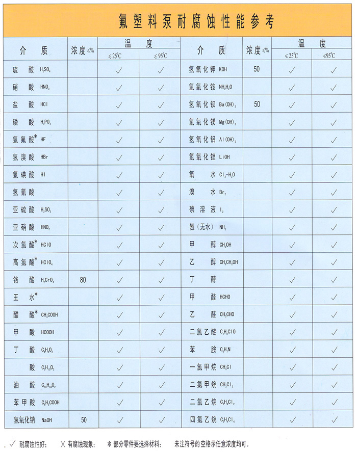 硫酸硝酸作為強腐蝕介質之一,而且是用途非常廣泛的重要工業原料。不同濃度和溫度的硫酸硝酸對材料的腐蝕差別較大,對于濃度在80%以上、溫度小于80℃的濃硫酸,碳鋼和鑄鐵有較好的耐蝕性,但它不適合高速流動的硫酸,不適用作泵閥的材料;普通不銹鋼如304(0Cr18Ni9)、316(0Cr18Ni12Mo2Ti)對硫酸介質也用途有限。因此輸送硫酸的泵閥通常采用高硅鑄鐵(鑄造及加工難度大)、高合金不銹鋼(20號合金)制造,但其加工難度大和價格昂貴,因此不被人們看好。氟塑料合金具有很好好的耐硫酸性能,它是中國科學院上海有機化學研究所的專利材料,現在被應用于制造耐腐蝕化工泵,經中科院實驗證明,目前尚未有哪種化學介質與其能產生反應,因此采用襯氟泵(F46)是一種更為經濟的選擇。